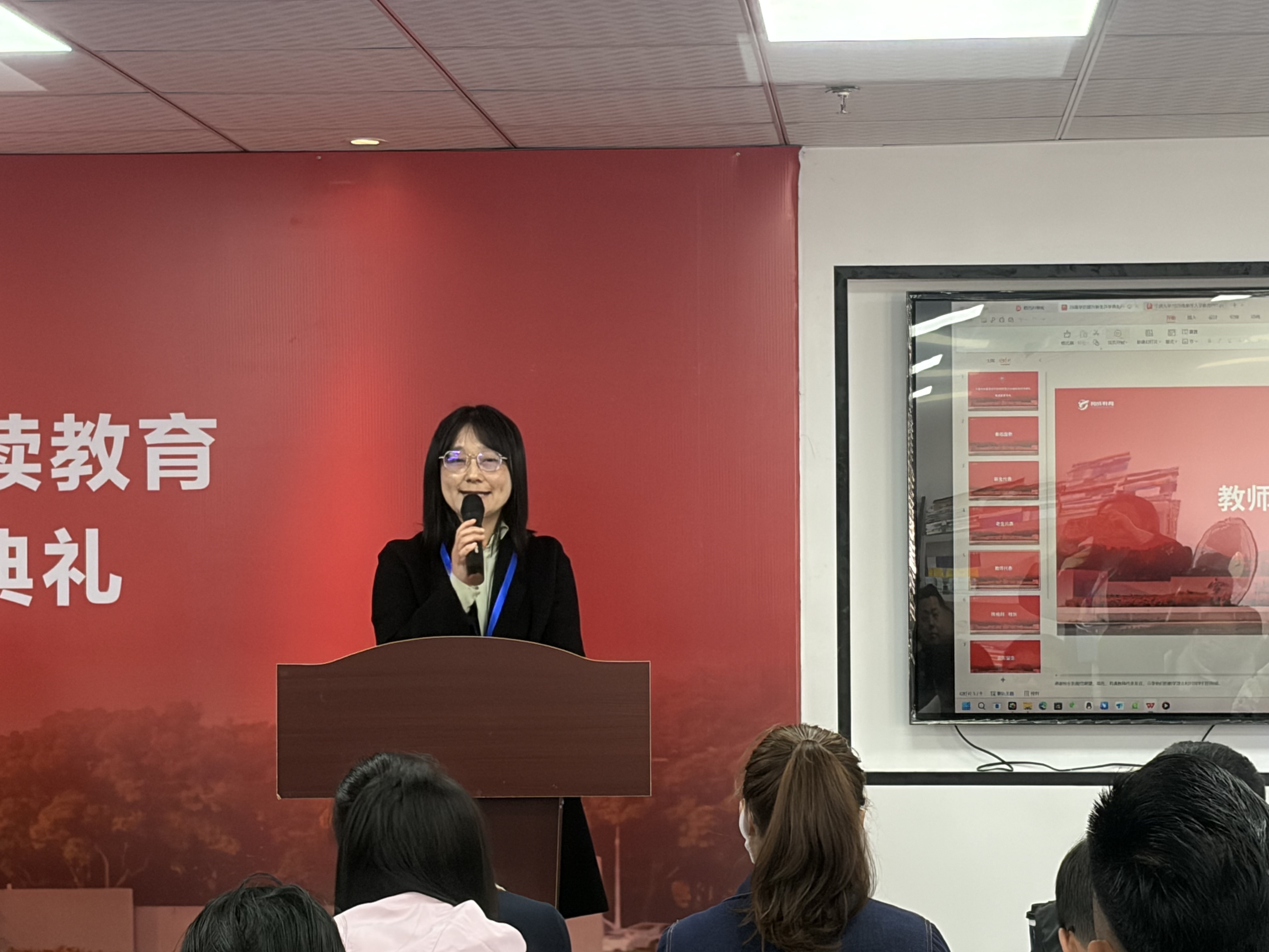 宁波大学育成教学点辅导教师俞建萍老师上台发言。俞老师娴静温婉、平易近人,深受广大师生喜爱与认可。她将以耐心细致的陪伴、专业悉心的指引,助力各位新同学快速融入浓厚的学习氛围。相信在俞老师与全体教师的陪伴下,新生定能逐梦前行、学有所成!