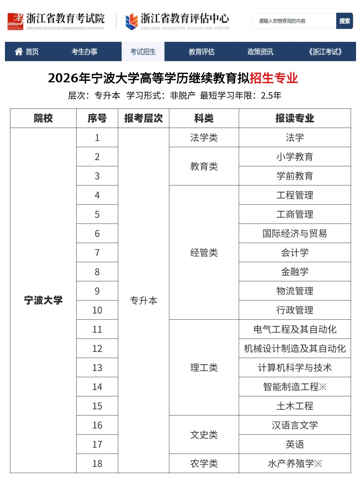 目前,宁波大学高等学历继续教育只招收专升本层次的学生。2026年拟招生专业见下表: